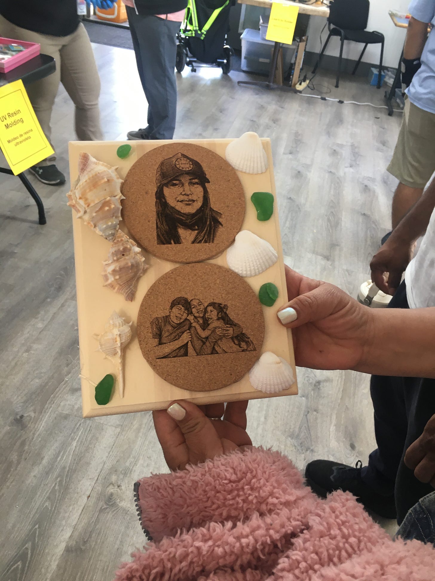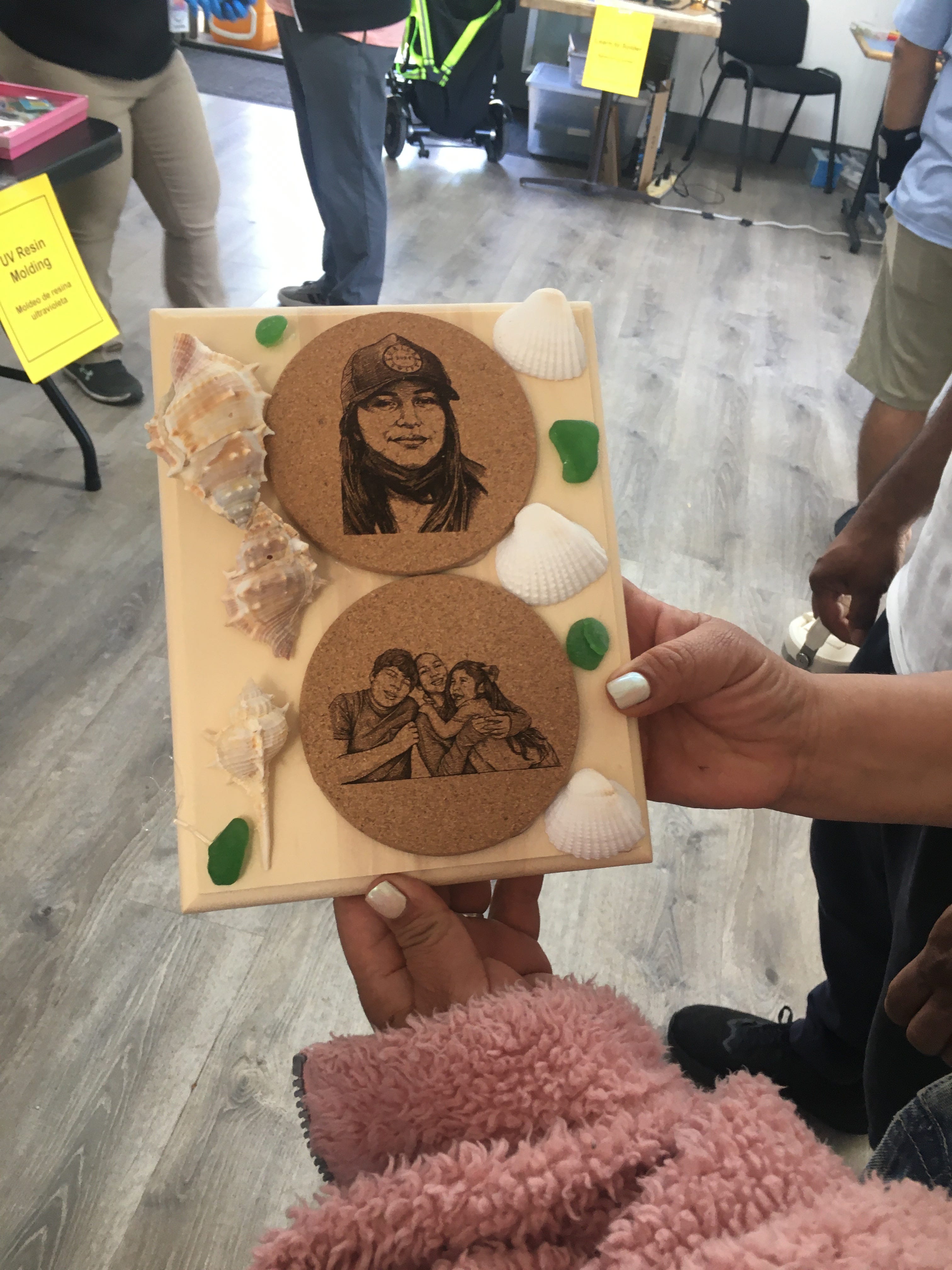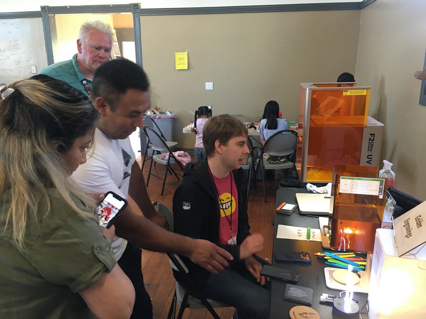 We had around 20 tubs of recyclables, leftover craft supplies, broken toy parts and together with about 5 pounds of hot glue that came together as an amazing variety of scavenged art projects. UV resin and glitter plus a huge variety of molds attracted adults and kids alike to make a variety of jewelry, dice, coasters, cute animal figurines and many other things.